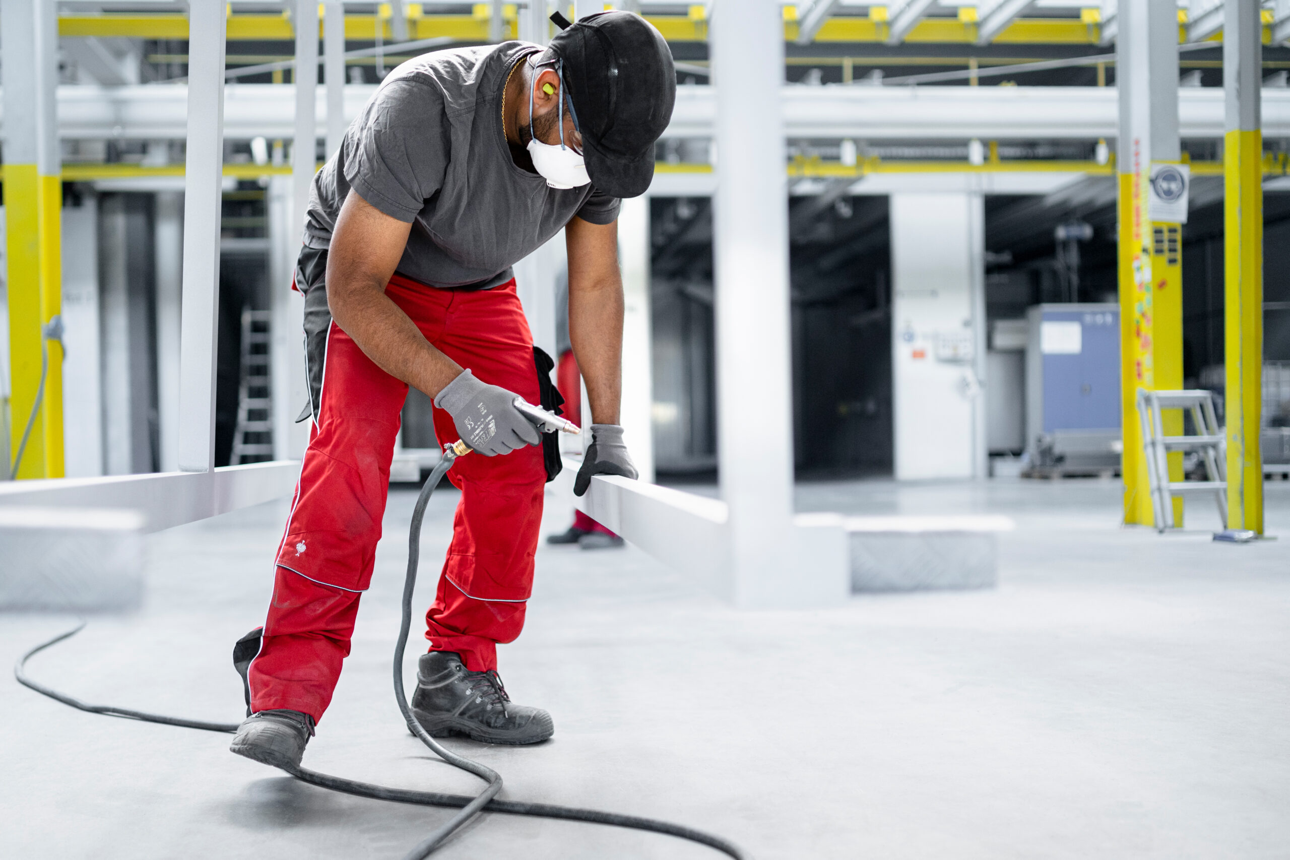 Die Applikation des Beschichtungsstoffs erfolgt überwiegend manuell mit einer Lackierpistole, unterstützt durch Applikationspumpen (Airless, Airmix oder elektrostatisch). Diese Methode ermöglicht eine besonders präzise, gleichmäßige Beschichtung auch komplexer Werkstückgeometrien.